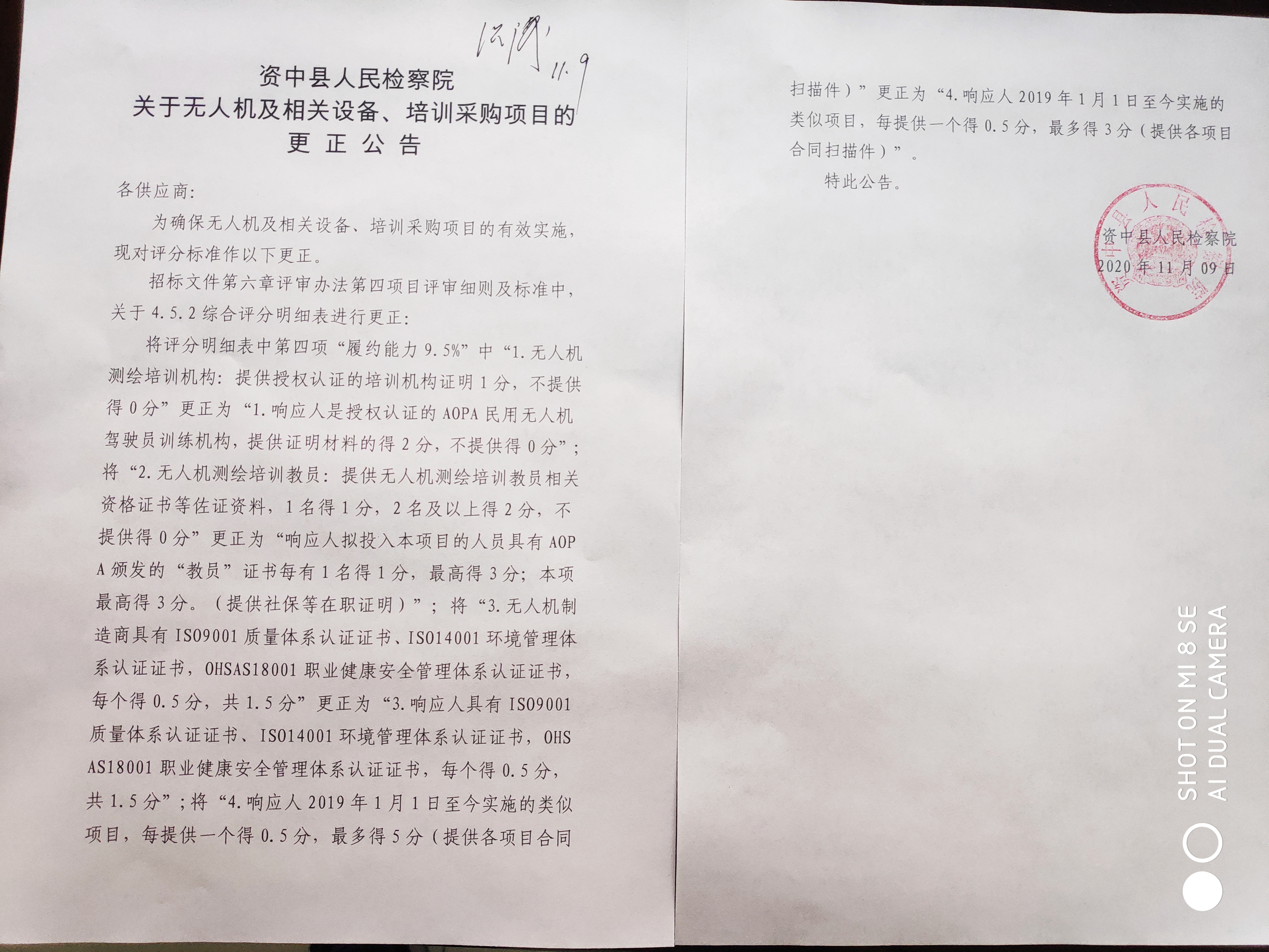 3.第六章 评审办法中4.5.2综合评分明细表 4履约能力修改为 1、响应人是授权认证的AOPA民用无人机驾驶员训练机构,提供证明材料的得2分,不提供得0分;2、响应人拟投入本项目的人员具有AOPA颁发的“教员”证书每有1名得1分,最高得3分;本项最高得3分。(提供社保等在职证明)3、响应人具有ISO9001质量体系认证证书、ISO14001环境管理体系认证证书,OHSAS18001职业健康安全管理体系认证证书,每个得0.5分,共1.5分。 4.响应人2019年1月1日至今实施的类似项目,每提供一个得0.5分,最多得3分。(提供各项目合同扫描件。)