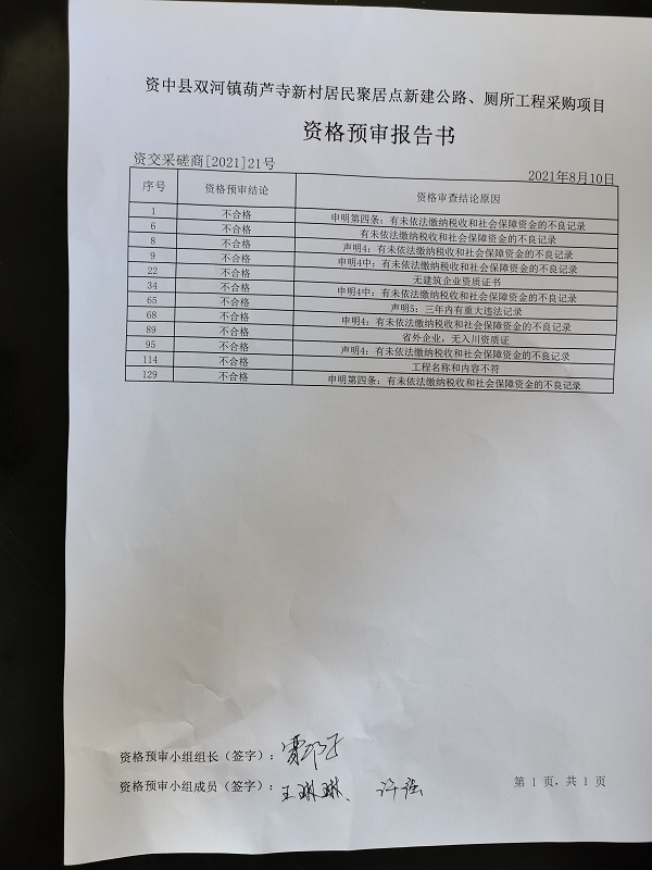 资中县双河镇葫芦寺新居民聚居点新建公路、厕所工程结果公示