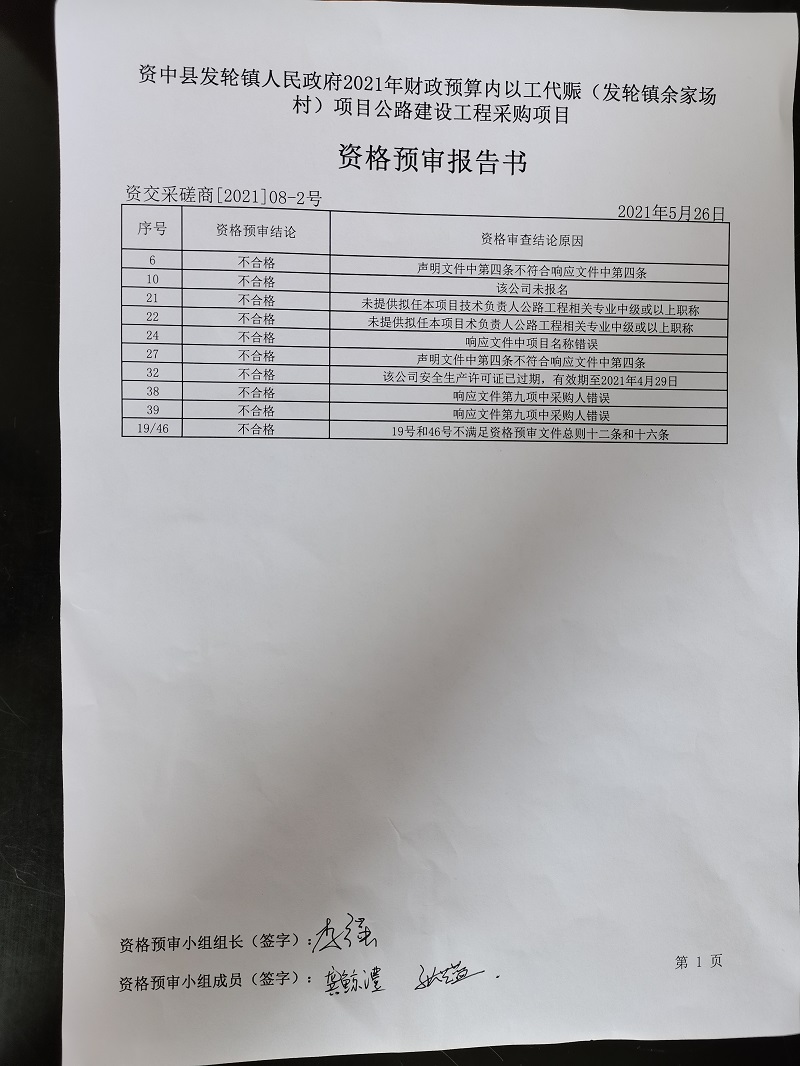 资中县发轮镇人民政府2021年财政预算内以工代赈(发轮镇余家场村)项目公路建设工程采购项目结果公示