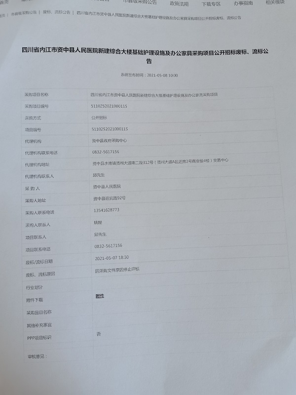 资中县人民医院新建综合大楼基础护理设施及办公家具采购项目结果公示