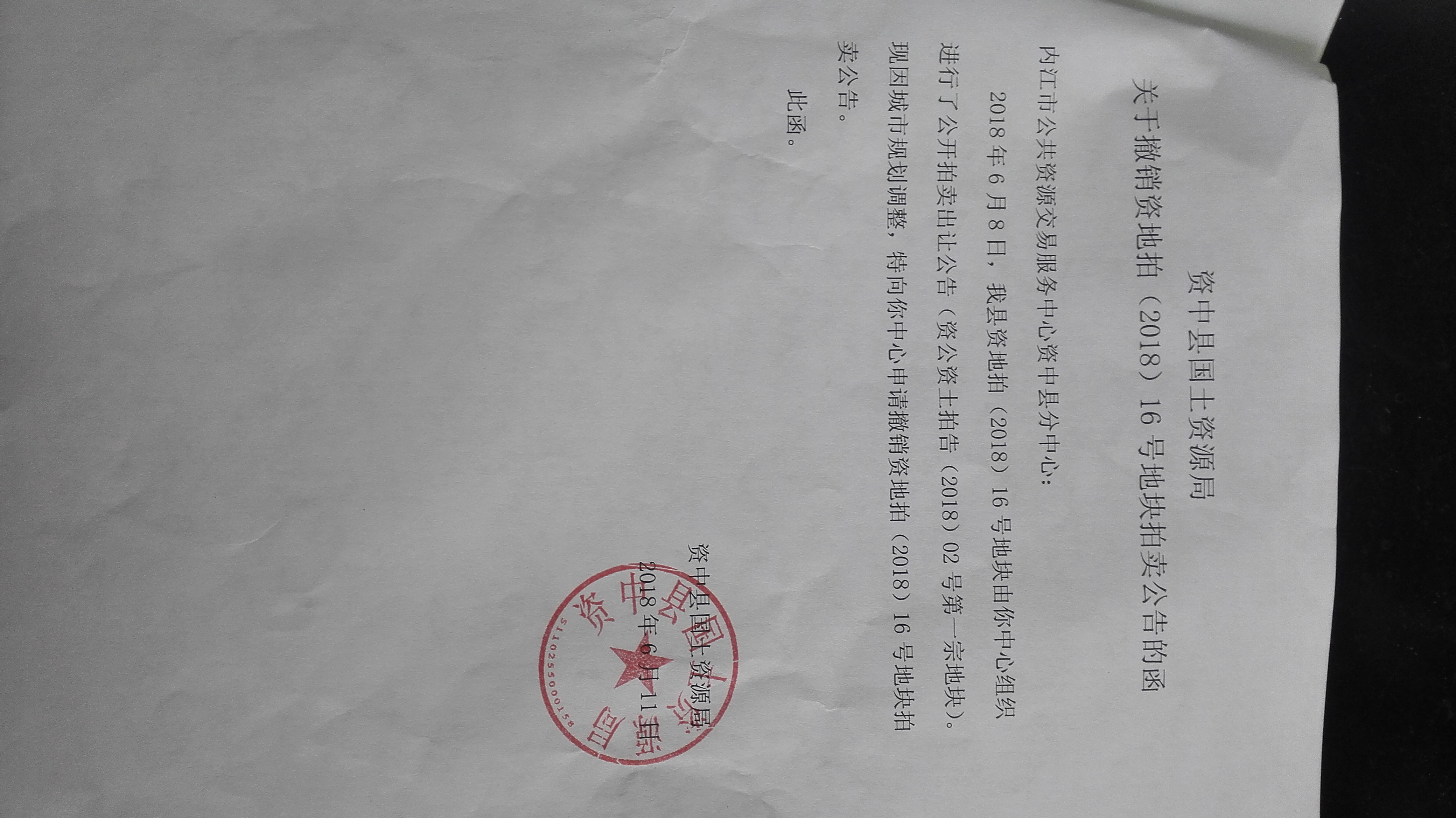 现因城市规划调整,资中县国土资源局特向我中心申请撤销资地拍(2018)16号地块拍卖(资公资土拍告(2018)02号中第一宗地块)。