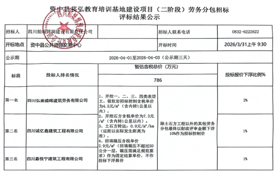 资中县苌弘教育培训基地建设项目(二阶段)劳务分包招标评标结果公示(1)