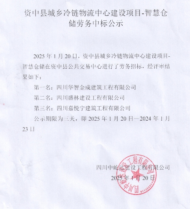 资中县城乡冷链物流中心建设项目-智慧仓储劳务中标公示