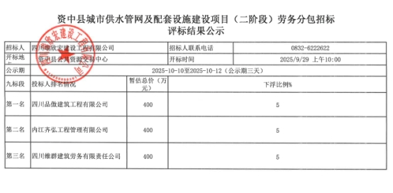 资中县城市供水管网及配套设施建设项目(二阶段)劳务分包招标评标结果公告