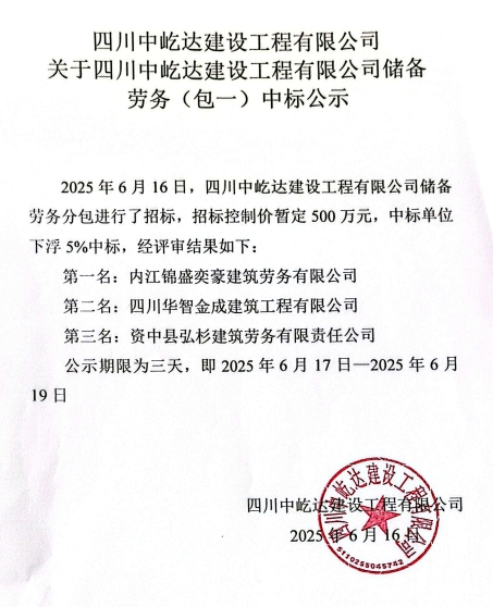 资中县城区停车场(一期)一阶段四标段劳务分包结果公示