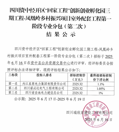 四川资中经开区“回家工程”创新创业孵化园三期工程-凤凰岭乡村振兴项目室外配套工程第阶段专业分包(第二次)结果公示