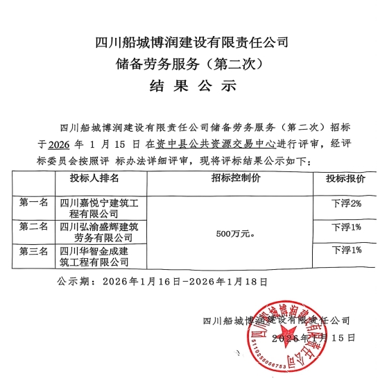 四川船城博润建设有限责任公司储备劳务服务(第二次)结果公示