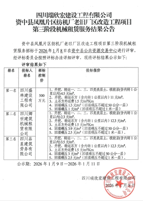 资中县凤凰片区纺机厂老旧厂区改造工程项目第三阶段机械租赁服务结果公告