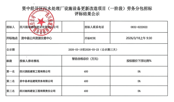 评标结果公示资中经开区污水处理厂设施设备更新改造项目(一阶段)劳务分包招标