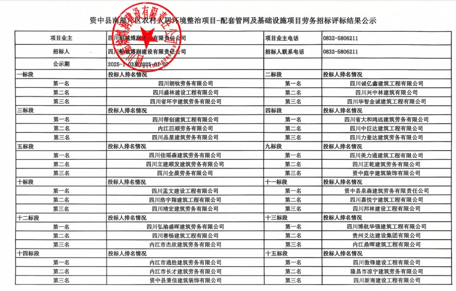 资中县南部片区农村人居环境整治项目-配套管网及基础设施项目劳务招标评标结果公示
