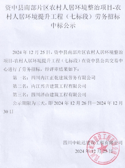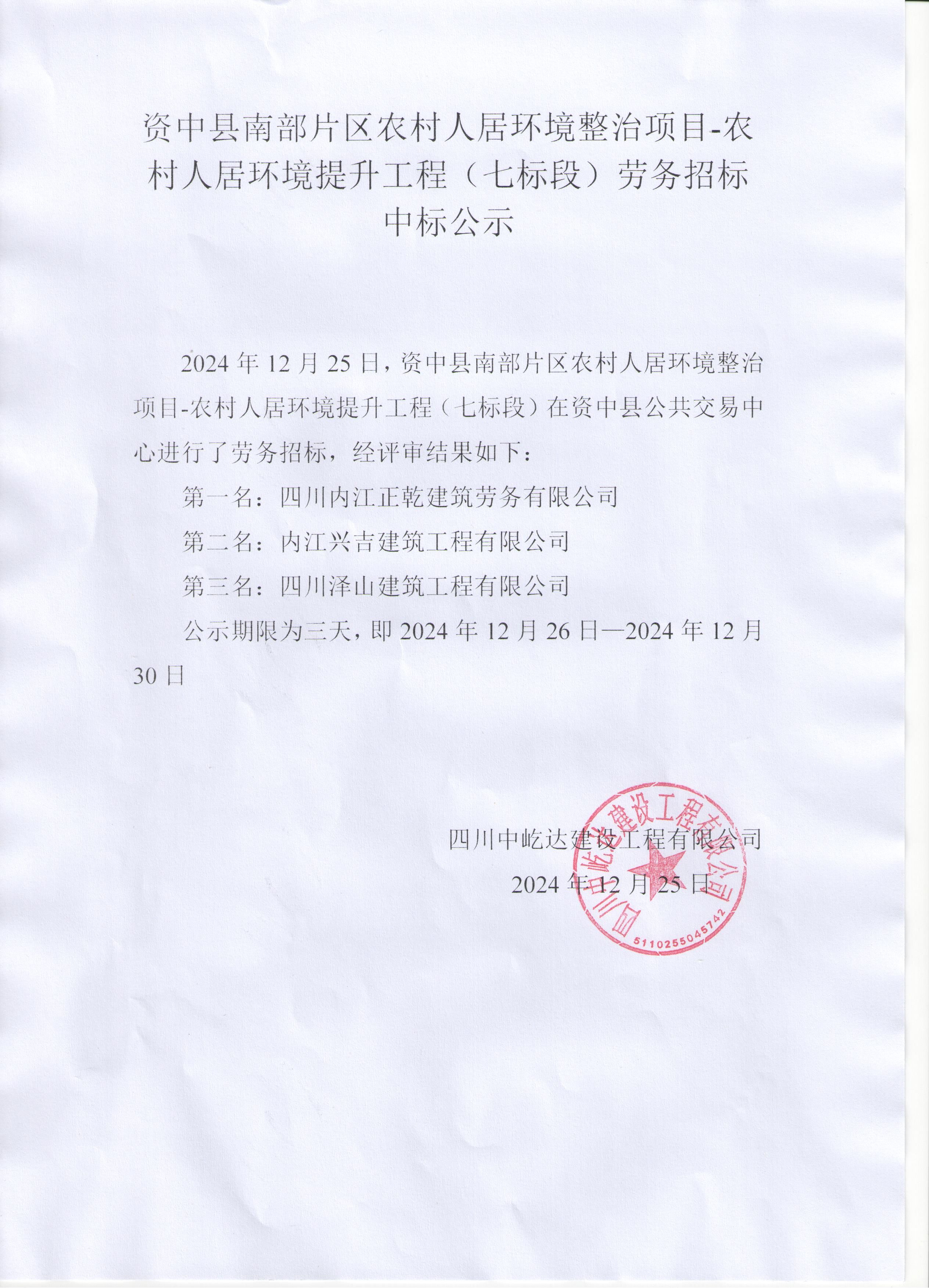 资中县南部片区农村人居环境整治项目-农村人居环境提升工程(七标段)劳务招标中标公示