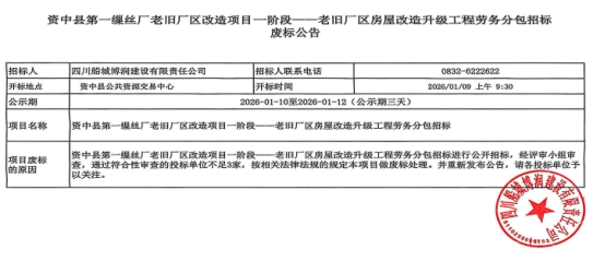 资中县第一缫丝厂老旧厂区改造项目一阶段——老旧厂区房屋改造升级工程劳务分包招标废